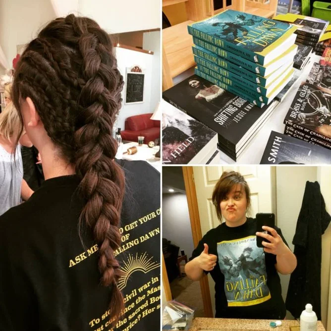 I'd brought an overabundance of novels, anticipating I'd sell every single copy (I sold one, thank you very much, and I'm not even ashamed at how many times I walked by the table checking to see if they needed to be restocked). I had T-shirts made up—and this was an ordeal in and of itself—with the book cover on the front and tasteful text across the shoulders. On the spur of the moment, I got my hair done up Viking-style with side braids and a huge epic braid poofed on top. My soon-to-be sister-in-law and make-up extraordinaire gave me a makeover with awesome peacock colors.